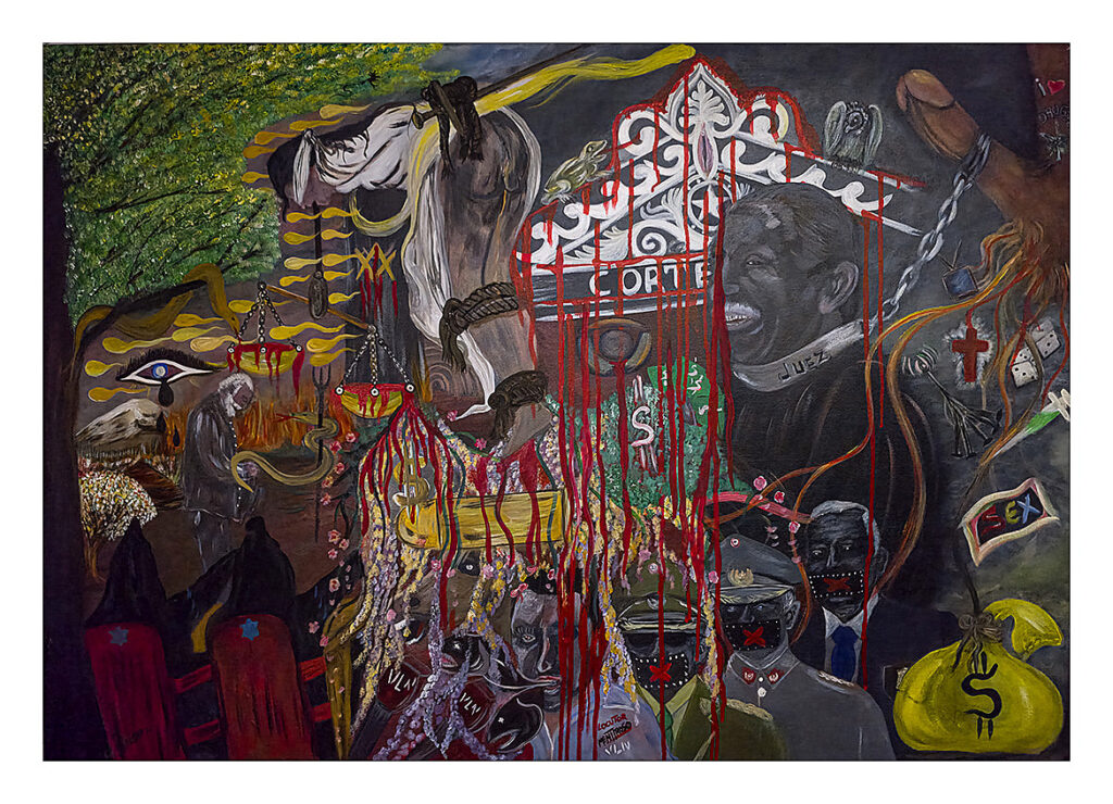 Hay buitres, múltiples signos que se entrecruzan. La propia justicia aparece ultrajada, amarrada de pies y manos. Es una escena intensa. También se ve un locutor —ahí se lee “locutor mentiroso”— como una alusión a cómo, muchas veces, los noticieros y la prensa pueden manipular los relatos en favor de quienes concentran el poder. La obra está llena de detalles: es un universo simbólico que invita a mirarla con atención. Tienen que verla.